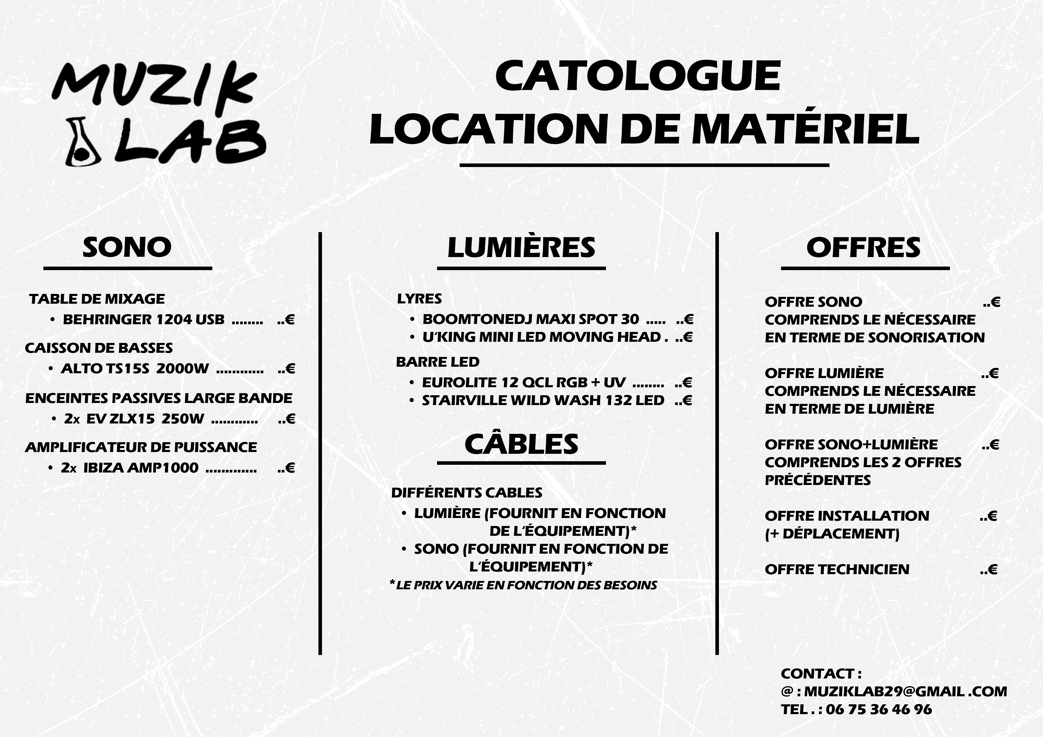 Chez Muzik Lab, nous proposons la location de matériel événementiel pour des événements à taille humaine : soirées privées, open airs, concerts associatifs, ou encore sets DJ en bar. Ce matériel est simple a utiliser et dispose de notice d’utilisation. Nous sommes basés autours de Quimper.